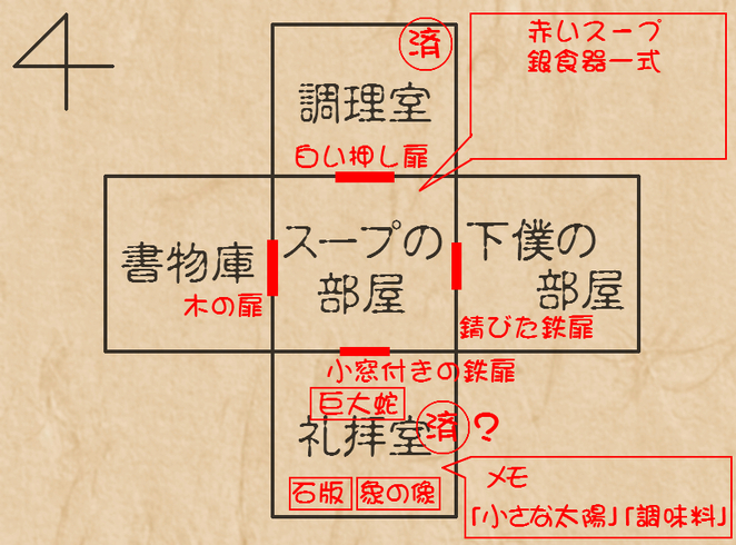 真ん中の部屋…ちゃんとしたスープを飲まないと出られない。メモの裏にはスープの正体が記されている。