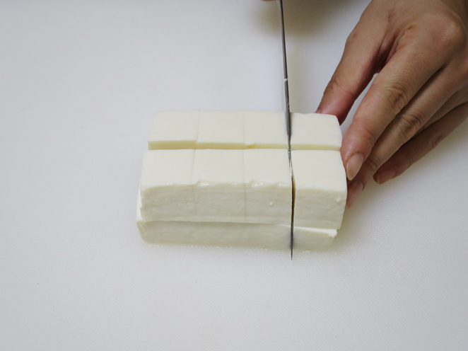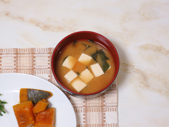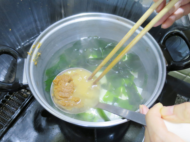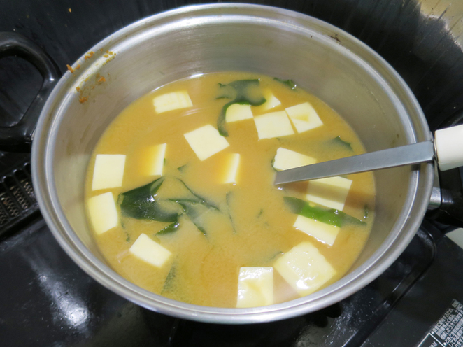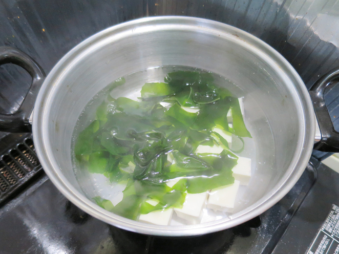 沸騰したお湯に豆腐とわかめを加え、少ししたら火を止める。