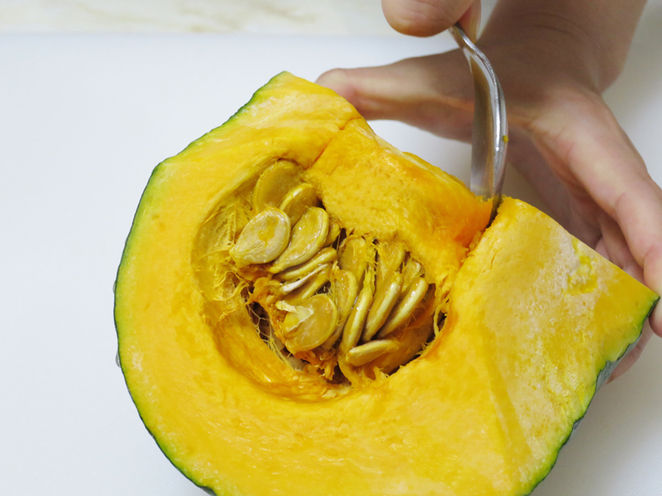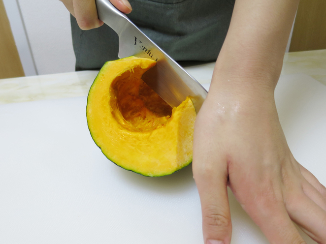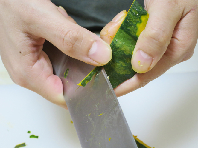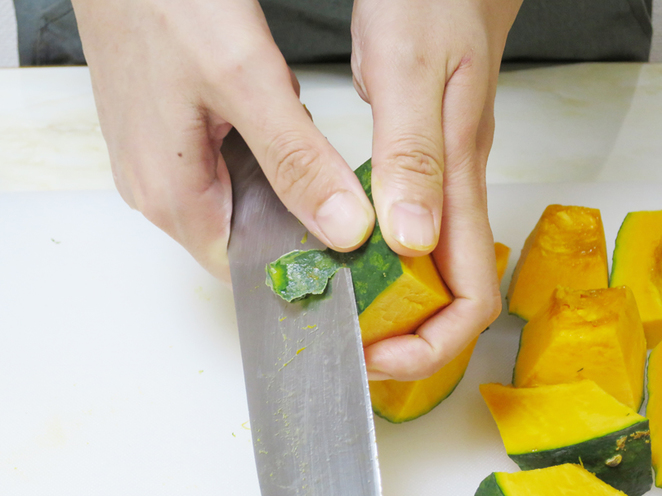 皮の堅い部分と、煮崩れ防止のために角を取る。