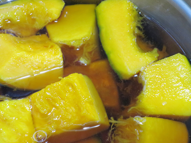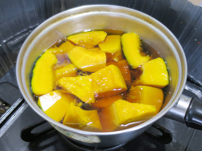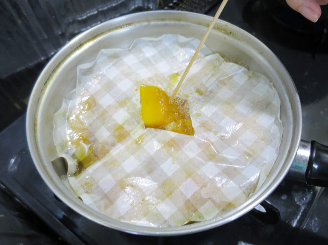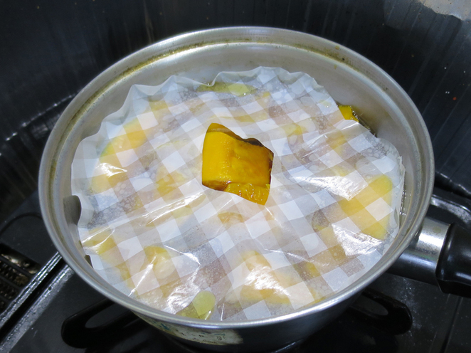 沸騰したら、カボチャを入れて落とし蓋をする。