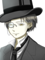 目線を前方に向けると、誰もいなかったはずなのに目の前には品のある美男子が立っていた。服装は黒色のフロック・コートの下に白いシャツ、ネクタイで少し明るい色のズボンを着用している。大きめのトップ・ハットが彼を更に紳士らしく仕立て上げていた。身長の彼を見上げるには首が痛くなる。