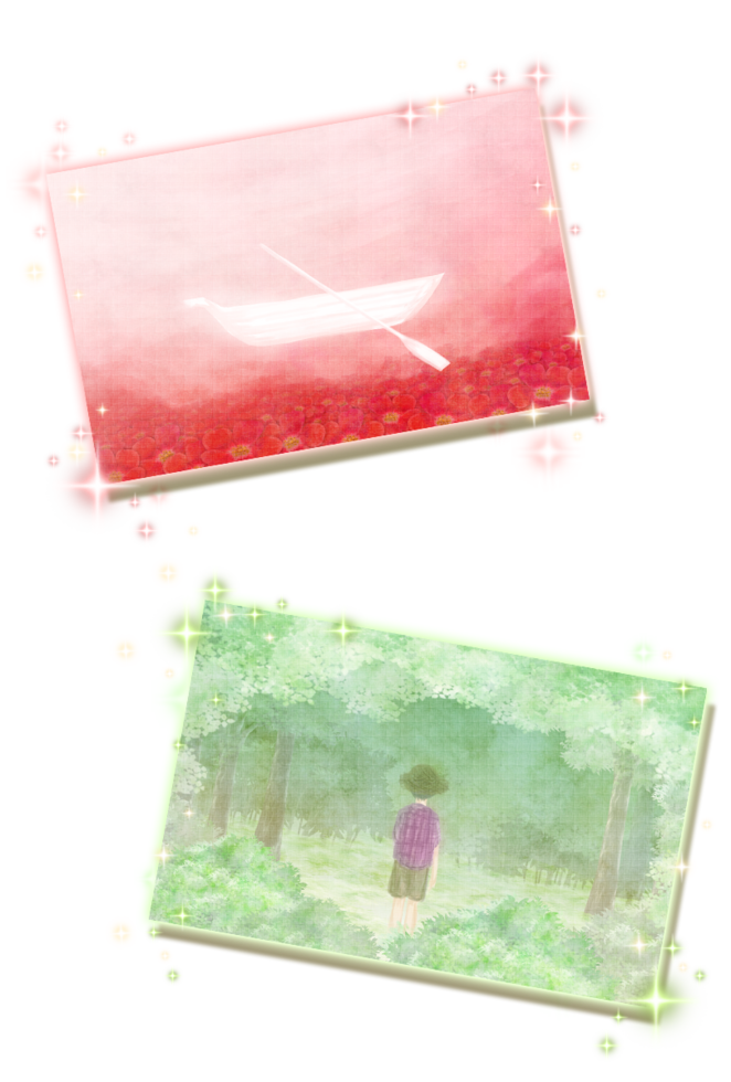 その次は、麦わら帽子をかぶった男の子、緑で埋め尽くされた森の中で、一人、緑に隠れてしまった空を見つめている。