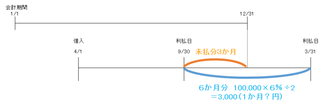 借入金100,000円は、4月1日に借入期間1年、利率年6%、利払日は9月末と3月末の条件で借り入れたものであるので、適切な処理を行う(決算日は12月31日)