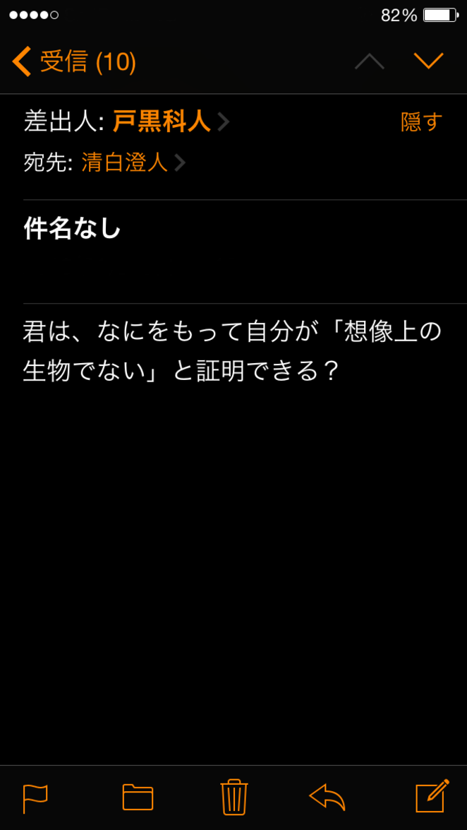 上の画像が見えるかい? ああ見えるよね。君の携帯の設定環境は過去に確認済みだ。この画像はね、灰塚ちゃんがタイムラインに上げたイケメン君の設定さ。身長一八二センチ、体重六五キロ。十七歳で、毎日ワックスやスプレーで綺麗に金髪を整えている。女の子にはとても優しく、困っている人は放っておけない。手鏡アプリをいつも持参しているが、それは自己顕示欲などではなく、人に対して粗相がないようチェックするためのもの。嫌いなものは悪者で、好きなものは――