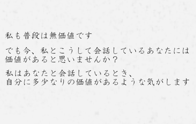 『あなたの言ったとおり、僕の中であなたは価値のある人になっているかもしれないですね。とても面白いと思います。考えてみると人の価値は自分自身では決められませんからね』