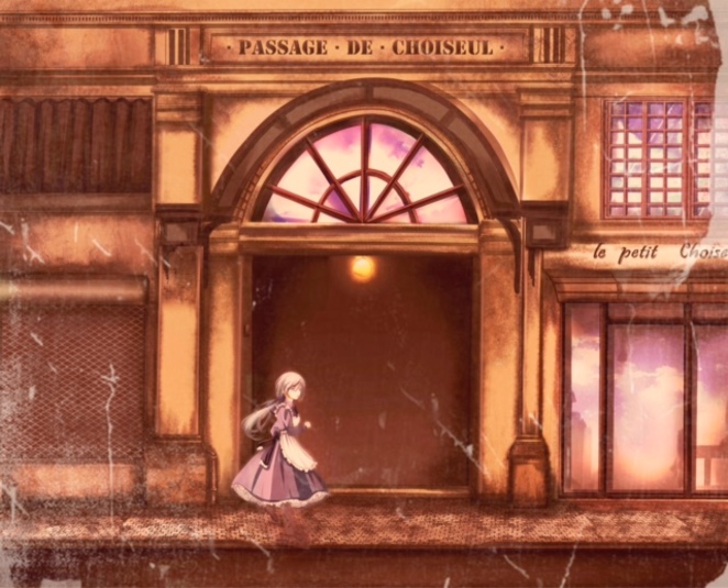 道のガス灯に点灯人が点火棒を伸ばして火を燈しはじめたので、そそくさとパサージュへ入ろうとしたその時であった。