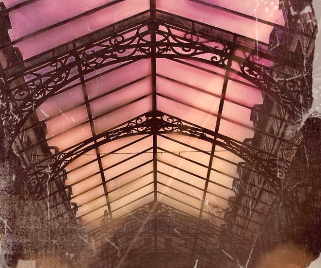 ガラス屋根には夕陽が反射しているものの、その中の通りはやはり薄暗い。