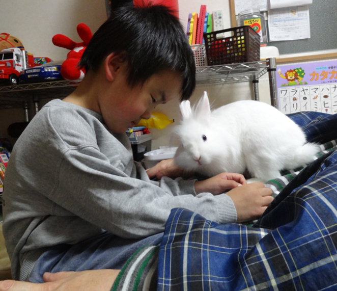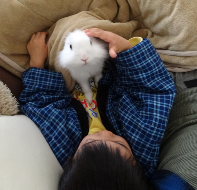 ボクは、みんなのお腹に乗るのが好きなんです。男の子が熱を出しているときは、心配でお父さんのお腹に乗って男の子を見ていました。