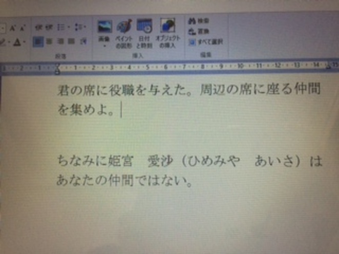 パソコンに打ち込まれた謎の文。取り敢えず最初に、俺と姫宮とかいう女の席が分かるよう書き出してみる。
