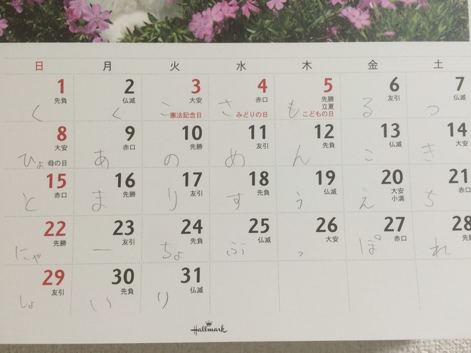 まず、カレンダーを座席に当てはめて、自分の席を見ると、「仏滅」なので、仏滅が自分の「役職」。同じ役職の日の文字を集めると、「くつこうぶり」この「くつこうぶり」が何か思い出せなくてちょっとググったところ、和歌の「暗号」みたいなものとのこと!
