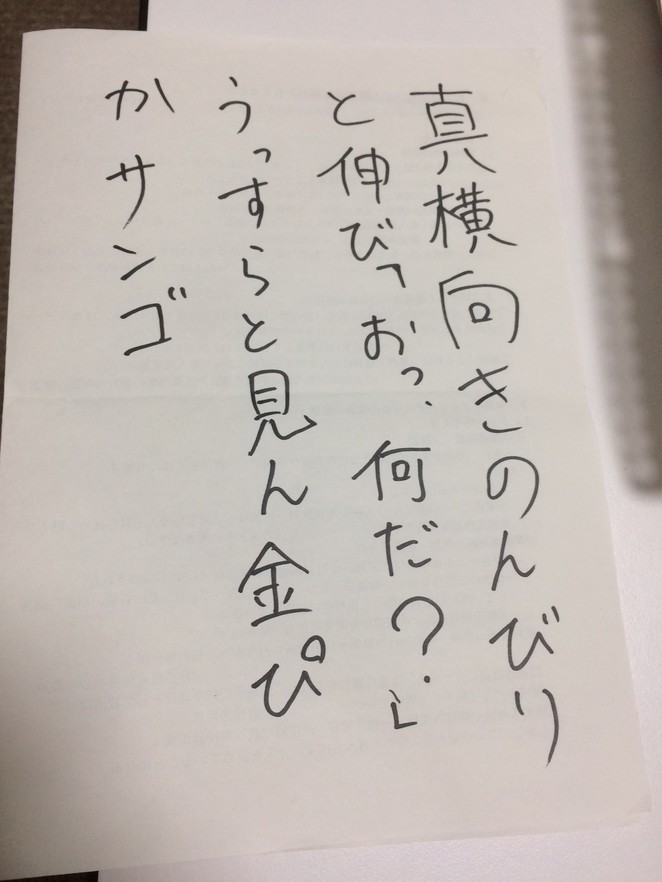 「祖父若き」「楽園の日々」「望むのだ」「失し時は来ん」「永遠に反故」の先頭の文字をつなげると「そらのうえ」そして、最後の文字では「きびだんご」