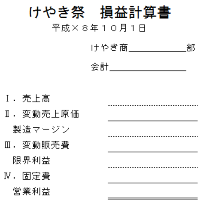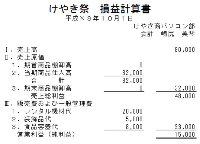 部長であるお姉から『会計係』に任命された私は、買い出しの際に発行してもらった領収書と、販売の際に使用した「食券」の半券をにらめっこしながら、簿記の知識を生かして「損益計算書」の作成を行っていた。