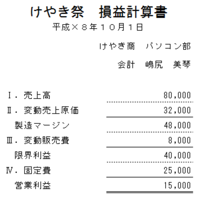 機材のレンタル代と、実行委員会から要求された分担金は、例え売上高が0でも計上される費用だから「固定費」ということになるわね。