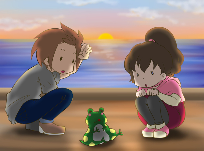 二人の前には、昨日港で見た丸々太ったカエルがいた。カエルは昨日と同じくふてぶてしく座っている。やはり腹を撫でてやると、気持ち良さげに喉の奥をならした。