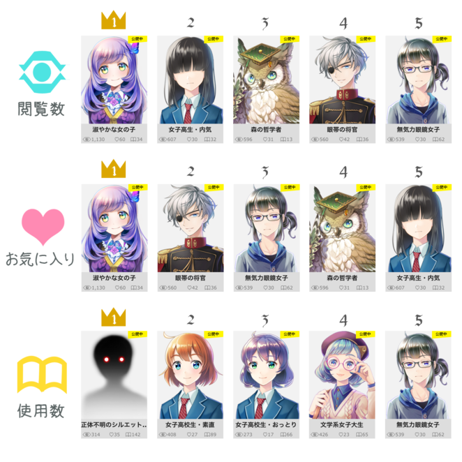 mtが制作したキャラアイコンの閲覧数・お気に入り・使用数のランキングだ