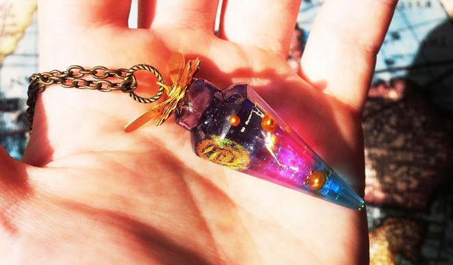 着物の袂から取り出す。ふたつあるうちのひとつを、わたしの両手におさめる。両手を広げると、そこには夕闇色のペンデュラムがコロンと転がっていた。