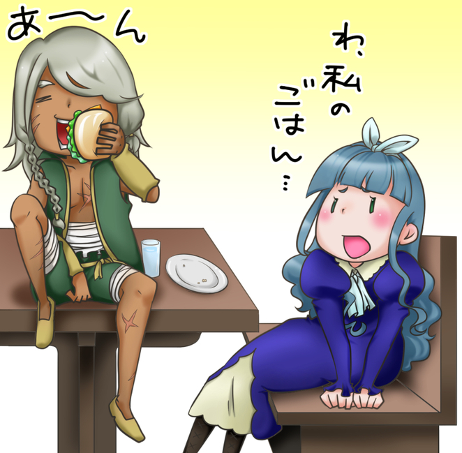 一人でいる空色の髪の女性は、ハル達六人を椅子から見上げた。ユフィはもう一度謝ってからタラトを叱り付けていた。そのタラトはファムンテンを食べ終わり、まだ足らないと周囲のテーブルを見回している。リュウがタラトの手を引き、自分達のテーブルを決めて案内した。