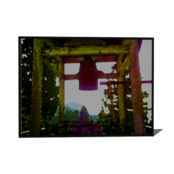 そびえ立つ山々と雲に囲まれたお寺の中の鐘が描かれた絵