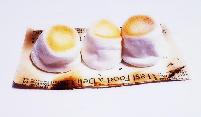 1.耐熱性のあるクッキングシート等にマシュマロを並べて載せ、オーブントースターで約1分加熱
