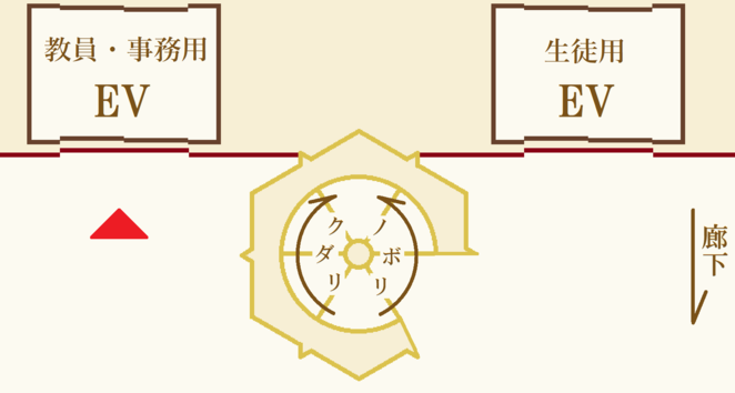 柱とかで死角になって廊下からは見えにくいんだけど、本当はこっちに先生用のエレベーターがあるの!