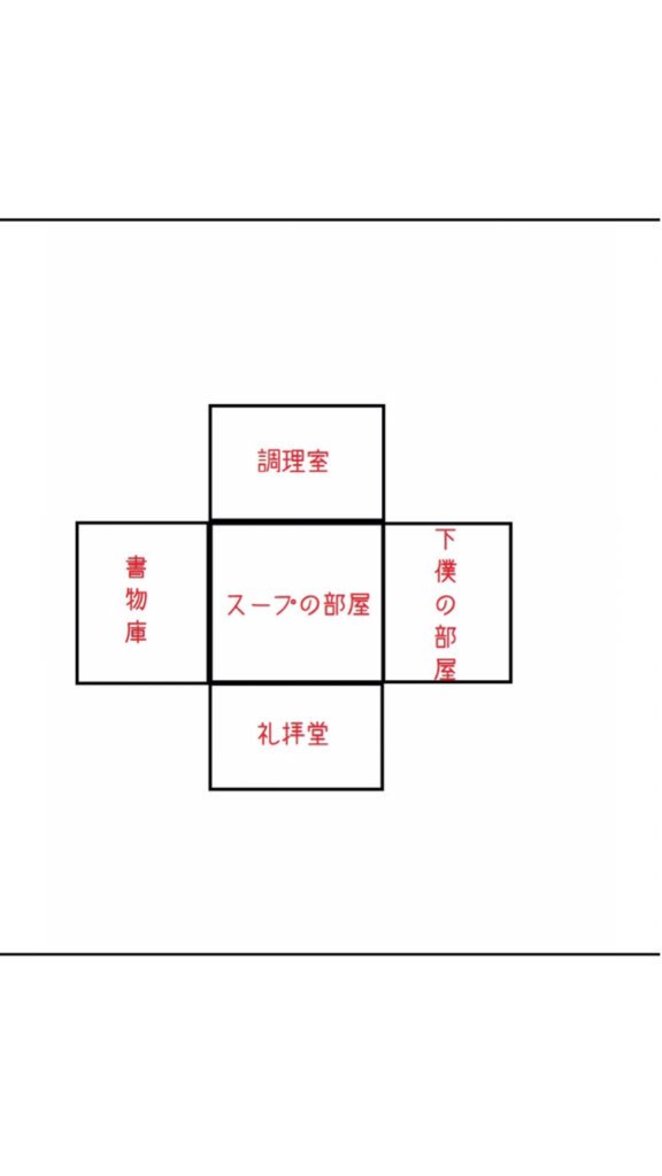 部屋の真ん中には古い木製の長机と椅子が一つあり、机の上には木製の器に入った、赤い無臭のスープが一つ…そして椅子の上には、古い紙切れが二つ落ちている。内容は次の通り