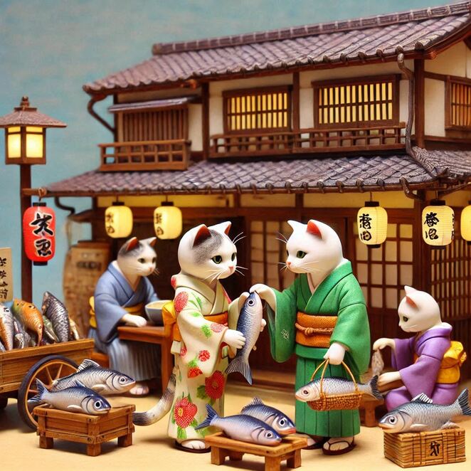 魚屋で値を値切るも猫