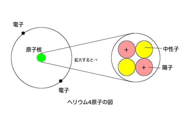 ヘリウム4の場合、原子核は陽子2つと中性子2つからできている