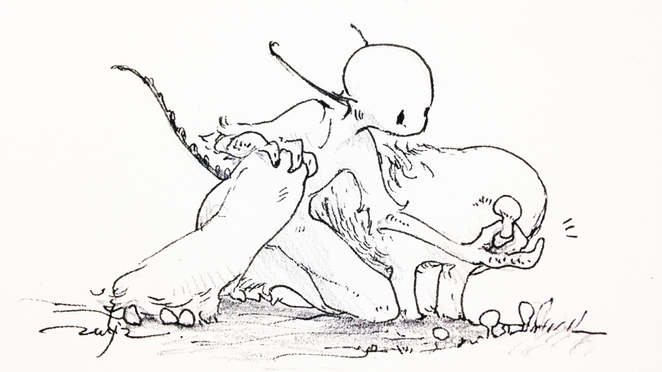 まだまだ子供だと思っていたが、フィールドワーカーもすっかり大人の背丈になったのだ。祖父と同じ歩幅でずんずん前を往く竜の子を、ドッグ・タンは倍の歩数で追いかけた。