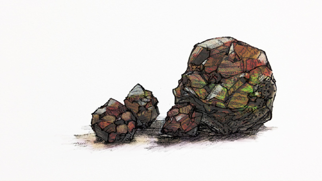 フィールドワーカーの手には、虹のように光るちいさな"柘榴石"の粒があった。